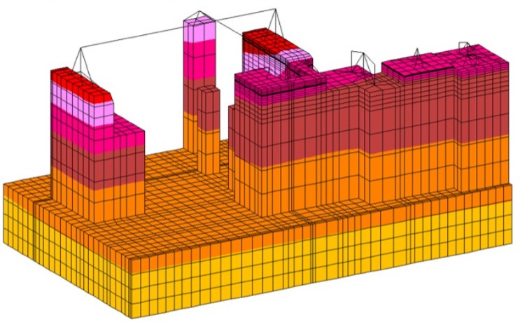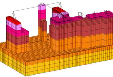 Development of detailed 3-D finite element models using ANSYS/ABAQUS/FEA tools for machine foundation systems, generating natural frequencies, mode shapes, stress/strain fields, and response under operational and seismic loads